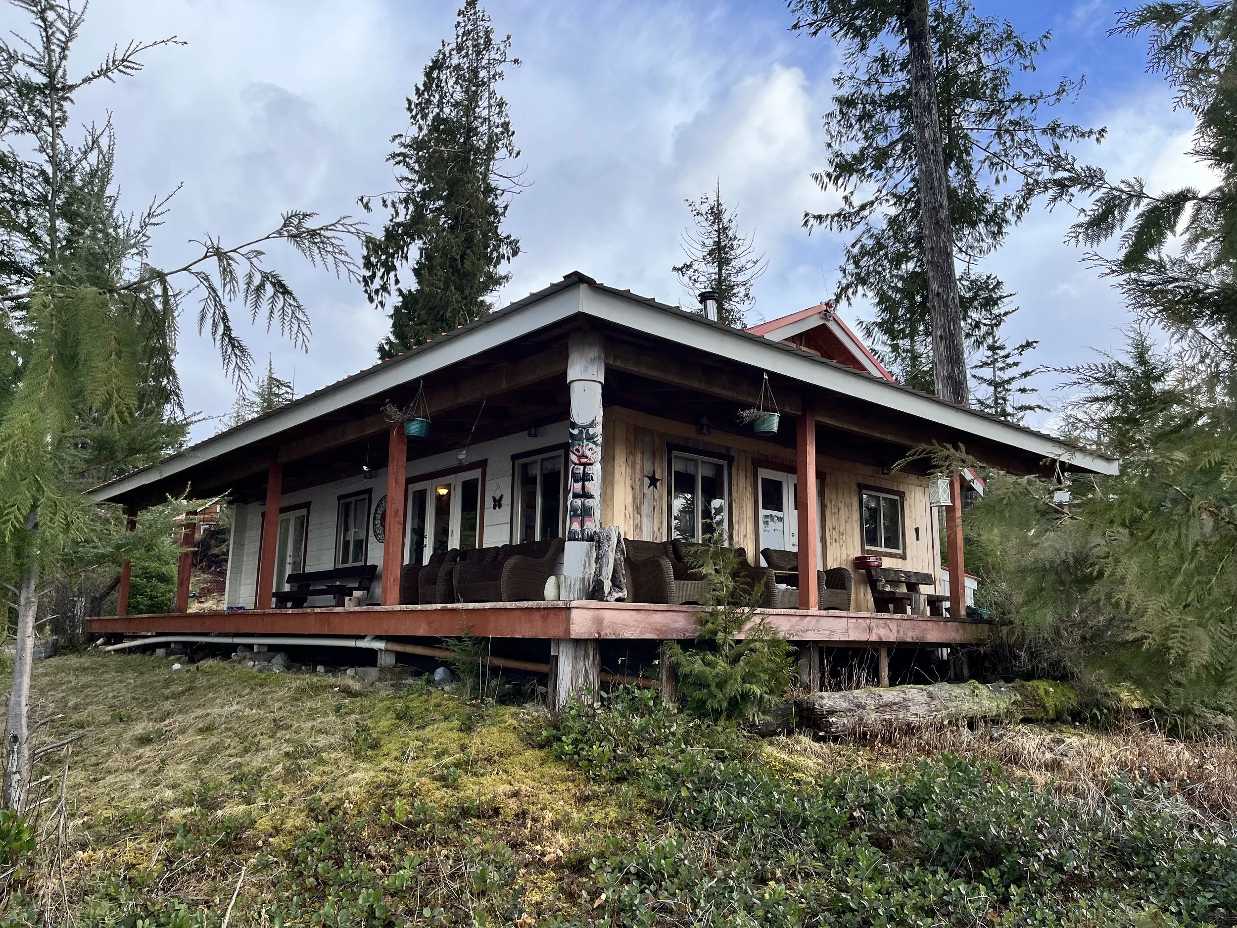 Covered deck, panoramic views, open concept design, Indigenous art and antique collection, private kitchen, two bedrooms.